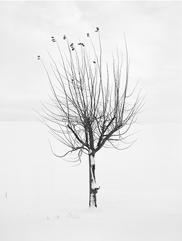 ... Das Arbeiten in seriellen Bilderfolgen prädestiniert den Künstler dazu, übergreifende Zusammenhänge zu veranschaulichen. Kurz und prägnant Trees – Bäume nennt der Fotograf seine 18-teilige Serie. Bekommt man nur einzelne Bilder dieser Folge zu Gesicht, wird der programmatische Gehalt nur schwerlich nachvollziehbar. Der gleiche Ausschnitt, die gleiche Komposition und Mittelstellung des Objektes und nahezu identische Lage des Horizontes, fordern unser Bildgedächtnis geradezu heraus, um die Verschiedenheit zu erkennen. In der geschlossenen Präsentation als Serie wird die ästhetische Dimension und künstlerische Strategie der Arbeiten allerdings augenfällig. Die Wiederholung des scheinbar Gleichen birgt bei eingehender Betrachtung eine Fülle markanter Unterschiede der Bäume in den Gestalt- und Entwicklungsformen – kräftig und ausladend oder schlank und aufstrebend, vielfältig verzweigt und offen oder dicht strukturiert und gedrängt, mit kugelförmiger oder pyramidaler Gestalt des Geästes, mit oder ohne Blätter am oberen Astwerk. Durch das kontrastlose Ineinanderübergehen der weißen Schneelandschaft mit dem bedeckten Himmel im Hintergrund wird die Illusion des dreidimensionalen Raumes zurückgenommen und er erscheint annähernd als monochrome Weißfläche, die einer weiteren Reduzierung im fotografischen Bild bereits Grenzen weist.