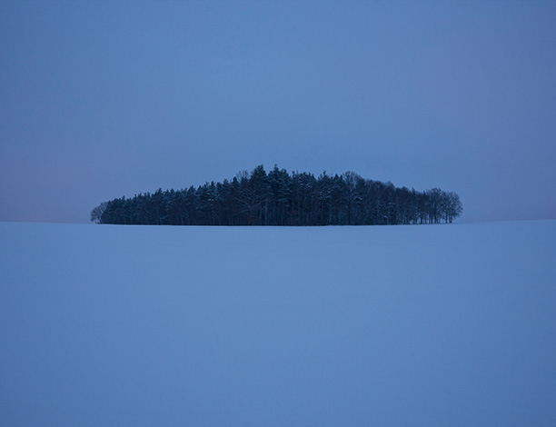... Auch die Arbeiten von Christoph Beer sind von einer starken Innerlichkeit geprägt. In seiner Serie „Standortbestimmung“ arbeitet er mit unterschiedlichen Einfärbungen der Landschaft, die jedoch keine Manipulation seinerseits sind, sondern reale Lichtstimmungen. Zu unterschiedlichen Tageszeiten eingefangen, wählt er als Ausgangspunkt stets das gleiche Motiv. Doch angesichts des unendlich wirkenden, mit Schnee bedeckten Feldes sowie einer nicht näher bestimmbaren Baumgruppe wird deutlich, dass es Beer nicht vorrangig um das offensichtlich Vorhandene im Bild geht. Vielmehr gerät die Suche nach immer dem gleichen Standort zur Suche nach inneren Wahrheiten. Die Form der Serie verdeutlicht dabei das Scheitern der genauen Verortung und führt darüber hinaus zu einer zunehmenden Abstrahierung der Bildelemente. So wendet er sich ab von der Fokussierung auf das vordergründig Sichtbare und konzentriert sich auf das Motiv als Träger seiner Reflexionen. Das wiederholte Zurückkehren zum Standort erhält dabei einen meditativen Charakter, wird zum Abarbeiten an einem Motiv – doch ohne negative Bedeutung, sondern als Teil des Bildfindungsprozesses.
