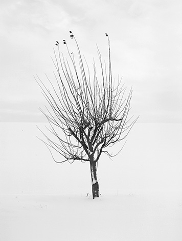 ... Das Arbeiten in seriellen Bilderfolgen prädestiniert den Künstler dazu, übergreifende Zusammenhänge zu veranschaulichen. Kurz und prägnant Trees – Bäume nennt der Fotograf seine 18-teilige Serie. Bekommt man nur einzelne Bilder dieser Folge zu Gesicht, wird der programmatische Gehalt nur schwerlich nachvollziehbar. Der gleiche Ausschnitt, die gleiche Komposition und Mittelstellung des Objektes und nahezu identische Lage des Horizontes, fordern unser Bildgedächtnis geradezu heraus, um die Verschiedenheit zu erkennen. In der geschlossenen Präsentation als Serie wird die ästhetische Dimension und künstlerische Strategie der Arbeiten allerdings augenfällig. Die Wiederholung des scheinbar Gleichen birgt bei eingehender Betrachtung eine Fülle markanter Unterschiede der Bäume in den Gestalt- und Entwicklungsformen – kräftig und ausladend oder schlank und aufstrebend, vielfältig verzweigt und offen oder dicht strukturiert und gedrängt, mit kugelförmiger oder pyramidaler Gestalt des Geästes, mit oder ohne Blätter am oberen Astwerk. Durch das kontrastlose Ineinanderübergehen der weißen Schneelandschaft mit dem bedeckten Himmel im Hintergrund wird die Illusion des dreidimensionalen Raumes zurückgenommen und er erscheint annähernd als monochrome Weißfläche, die einer weiteren Reduzierung im fotografischen Bild bereits Grenzen weist.