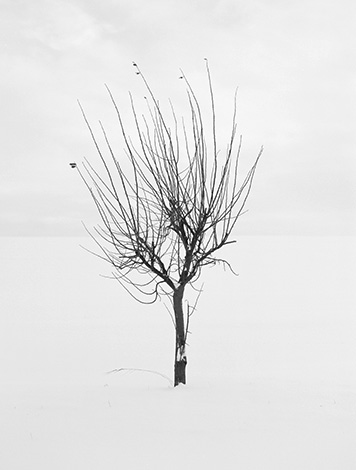 ... Das Arbeiten in seriellen Bilderfolgen prädestiniert den Künstler dazu, übergreifende Zusammenhänge zu veranschaulichen. Kurz und prägnant Trees – Bäume nennt der Fotograf seine 18-teilige Serie. Bekommt man nur einzelne Bilder dieser Folge zu Gesicht, wird der programmatische Gehalt nur schwerlich nachvollziehbar. Der gleiche Ausschnitt, die gleiche Komposition und Mittelstellung des Objektes und nahezu identische Lage des Horizontes, fordern unser Bildgedächtnis geradezu heraus, um die Verschiedenheit zu erkennen. In der geschlossenen Präsentation als Serie wird die ästhetische Dimension und künstlerische Strategie der Arbeiten allerdings augenfällig. Die Wiederholung des scheinbar Gleichen birgt bei eingehender Betrachtung eine Fülle markanter Unterschiede der Bäume in den Gestalt- und Entwicklungsformen – kräftig und ausladend oder schlank und aufstrebend, vielfältig verzweigt und offen oder dicht strukturiert und gedrängt, mit kugelförmiger oder pyramidaler Gestalt des Geästes, mit oder ohne Blätter am oberen Astwerk. Durch das kontrastlose Ineinanderübergehen der weißen Schneelandschaft mit dem bedeckten Himmel im Hintergrund wird die Illusion des dreidimensionalen Raumes zurückgenommen und er erscheint annähernd als monochrome Weißfläche, die einer weiteren Reduzierung im fotografischen Bild bereits Grenzen weist.