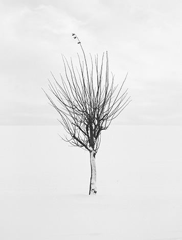 ... Das Arbeiten in seriellen Bilderfolgen prädestiniert den Künstler dazu, übergreifende Zusammenhänge zu veranschaulichen. Kurz und prägnant Trees – Bäume nennt der Fotograf seine 18-teilige Serie. Bekommt man nur einzelne Bilder dieser Folge zu Gesicht, wird der programmatische Gehalt nur schwerlich nachvollziehbar. Der gleiche Ausschnitt, die gleiche Komposition und Mittelstellung des Objektes und nahezu identische Lage des Horizontes, fordern unser Bildgedächtnis geradezu heraus, um die Verschiedenheit zu erkennen. In der geschlossenen Präsentation als Serie wird die ästhetische Dimension und künstlerische Strategie der Arbeiten allerdings augenfällig. Die Wiederholung des scheinbar Gleichen birgt bei eingehender Betrachtung eine Fülle markanter Unterschiede der Bäume in den Gestalt- und Entwicklungsformen – kräftig und ausladend oder schlank und aufstrebend, vielfältig verzweigt und offen oder dicht strukturiert und gedrängt, mit kugelförmiger oder pyramidaler Gestalt des Geästes, mit oder ohne Blätter am oberen Astwerk. Durch das kontrastlose Ineinanderübergehen der weißen Schneelandschaft mit dem bedeckten Himmel im Hintergrund wird die Illusion des dreidimensionalen Raumes zurückgenommen und er erscheint annähernd als monochrome Weißfläche, die einer weiteren Reduzierung im fotografischen Bild bereits Grenzen weist.