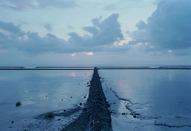 Durch die Variation seines Blickwinkels komponierte er das Bildarrangement im Sucher der Kamera, lässt das traditionelle harmonische Maßverhältnis des Goldenen Schnittes außer Acht und drängt die Horizontlinie in allen Arbeiten der Serie konsequent zur Bildmitte. Wie eine systematisierende Schablone legt er dieses kompositorische Element der Bildgestaltung allen Einzelaufnahmen zu Grunde. Die vor dem Horizont parallel lagernden oder zum Mittelpunkt zulaufenden Wellenbrecher verweisen in ihrer augenscheinlichen Geradlinigkeit auf den gestaltenden Eingriff des Menschen in die Natur, dem sich nur die lebendigen Wolkenformationen entziehen, die ihre amorphen Spiegelbilder auf die glatte Wasseroberfläche werfen. Christoph Beer erweist sich als aufmerksamer und distanzierter Beobachter und präsentiert die künstlich manipulierte Naturlandschaft als uniformes Modell, das nicht allein den inhärenten Gestaltungskräften der Natur unterliegt, sondern vielmehr dem Maß und den Ordnungskategorien der menschlichen Spezies. Er spielt allerdings auch mit der Verunsicherung unserer Wahrnehmung, bricht die Ruhe der strengen formalästhetischen Gestaltung durch das ungewöhnliche Licht- und Schattenspiel seiner Bilder auf und verleiht der scheinbaren Romantik etwas Dramatisches und Apokalyptisches.