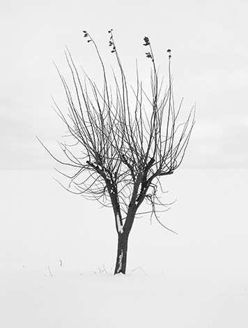 ... Das Arbeiten in seriellen Bilderfolgen prädestiniert den Künstler dazu, übergreifende Zusammenhänge zu veranschaulichen. Kurz und prägnant Trees – Bäume nennt der Fotograf seine 18-teilige Serie. Bekommt man nur einzelne Bilder dieser Folge zu Gesicht, wird der programmatische Gehalt nur schwerlich nachvollziehbar. Der gleiche Ausschnitt, die gleiche Komposition und Mittelstellung des Objektes und nahezu identische Lage des Horizontes, fordern unser Bildgedächtnis geradezu heraus, um die Verschiedenheit zu erkennen. In der geschlossenen Präsentation als Serie wird die ästhetische Dimension und künstlerische Strategie der Arbeiten allerdings augenfällig. Die Wiederholung des scheinbar Gleichen birgt bei eingehender Betrachtung eine Fülle markanter Unterschiede der Bäume in den Gestalt- und Entwicklungsformen – kräftig und ausladend oder schlank und aufstrebend, vielfältig verzweigt und offen oder dicht strukturiert und gedrängt, mit kugelförmiger oder pyramidaler Gestalt des Geästes, mit oder ohne Blätter am oberen Astwerk. Durch das kontrastlose Ineinanderübergehen der weißen Schneelandschaft mit dem bedeckten Himmel im Hintergrund wird die Illusion des dreidimensionalen Raumes zurückgenommen und er erscheint annähernd als monochrome Weißfläche, die einer weiteren Reduzierung im fotografischen Bild bereits Grenzen weist.