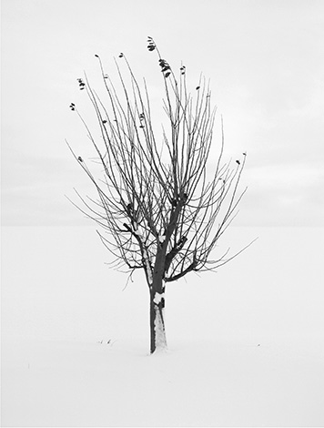 ... Das Arbeiten in seriellen Bilderfolgen prädestiniert den Künstler dazu, übergreifende Zusammenhänge zu veranschaulichen. Kurz und prägnant Trees – Bäume nennt der Fotograf seine 18-teilige Serie. Bekommt man nur einzelne Bilder dieser Folge zu Gesicht, wird der programmatische Gehalt nur schwerlich nachvollziehbar. Der gleiche Ausschnitt, die gleiche Komposition und Mittelstellung des Objektes und nahezu identische Lage des Horizontes, fordern unser Bildgedächtnis geradezu heraus, um die Verschiedenheit zu erkennen. In der geschlossenen Präsentation als Serie wird die ästhetische Dimension und künstlerische Strategie der Arbeiten allerdings augenfällig. Die Wiederholung des scheinbar Gleichen birgt bei eingehender Betrachtung eine Fülle markanter Unterschiede der Bäume in den Gestalt- und Entwicklungsformen – kräftig und ausladend oder schlank und aufstrebend, vielfältig verzweigt und offen oder dicht strukturiert und gedrängt, mit kugelförmiger oder pyramidaler Gestalt des Geästes, mit oder ohne Blätter am oberen Astwerk. Durch das kontrastlose Ineinanderübergehen der weißen Schneelandschaft mit dem bedeckten Himmel im Hintergrund wird die Illusion des dreidimensionalen Raumes zurückgenommen und er erscheint annähernd als monochrome Weißfläche, die einer weiteren Reduzierung im fotografischen Bild bereits Grenzen weist.