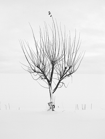 ... Das Arbeiten in seriellen Bilderfolgen prädestiniert den Künstler dazu, übergreifende Zusammenhänge zu veranschaulichen. Kurz und prägnant Trees – Bäume nennt der Fotograf seine 18-teilige Serie. Bekommt man nur einzelne Bilder dieser Folge zu Gesicht, wird der programmatische Gehalt nur schwerlich nachvollziehbar. Der gleiche Ausschnitt, die gleiche Komposition und Mittelstellung des Objektes und nahezu identische Lage des Horizontes, fordern unser Bildgedächtnis geradezu heraus, um die Verschiedenheit zu erkennen. In der geschlossenen Präsentation als Serie wird die ästhetische Dimension und künstlerische Strategie der Arbeiten allerdings augenfällig. Die Wiederholung des scheinbar Gleichen birgt bei eingehender Betrachtung eine Fülle markanter Unterschiede der Bäume in den Gestalt- und Entwicklungsformen – kräftig und ausladend oder schlank und aufstrebend, vielfältig verzweigt und offen oder dicht strukturiert und gedrängt, mit kugelförmiger oder pyramidaler Gestalt des Geästes, mit oder ohne Blätter am oberen Astwerk. Durch das kontrastlose Ineinanderübergehen der weißen Schneelandschaft mit dem bedeckten Himmel im Hintergrund wird die Illusion des dreidimensionalen Raumes zurückgenommen und er erscheint annähernd als monochrome Weißfläche, die einer weiteren Reduzierung im fotografischen Bild bereits Grenzen weist.