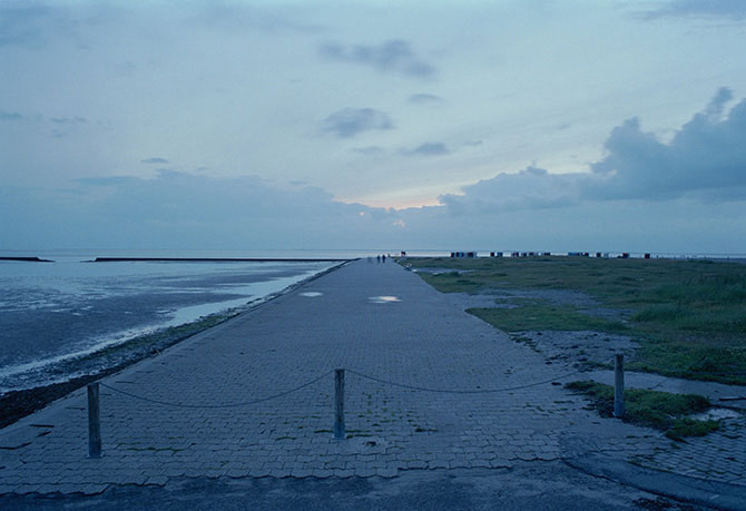 Die vor dem Horizont parallel lagernden oder zum Mittelpunkt zulaufenden Wellenbrecher verweisen in ihrer augenscheinlichen Geradlinigkeit auf den gestaltenden Eingriff des Menschen in die Natur, dem sich nur die lebendigen Wolkenformationen entziehen, die ihre amorphen Spiegelbilder auf die glatte Wasseroberfläche werfen.